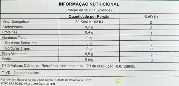 Ingredientes: banana, ácido cítrico e sorbato de potássio. Elas têm validade de 1 ano e não precisam de geladeira.